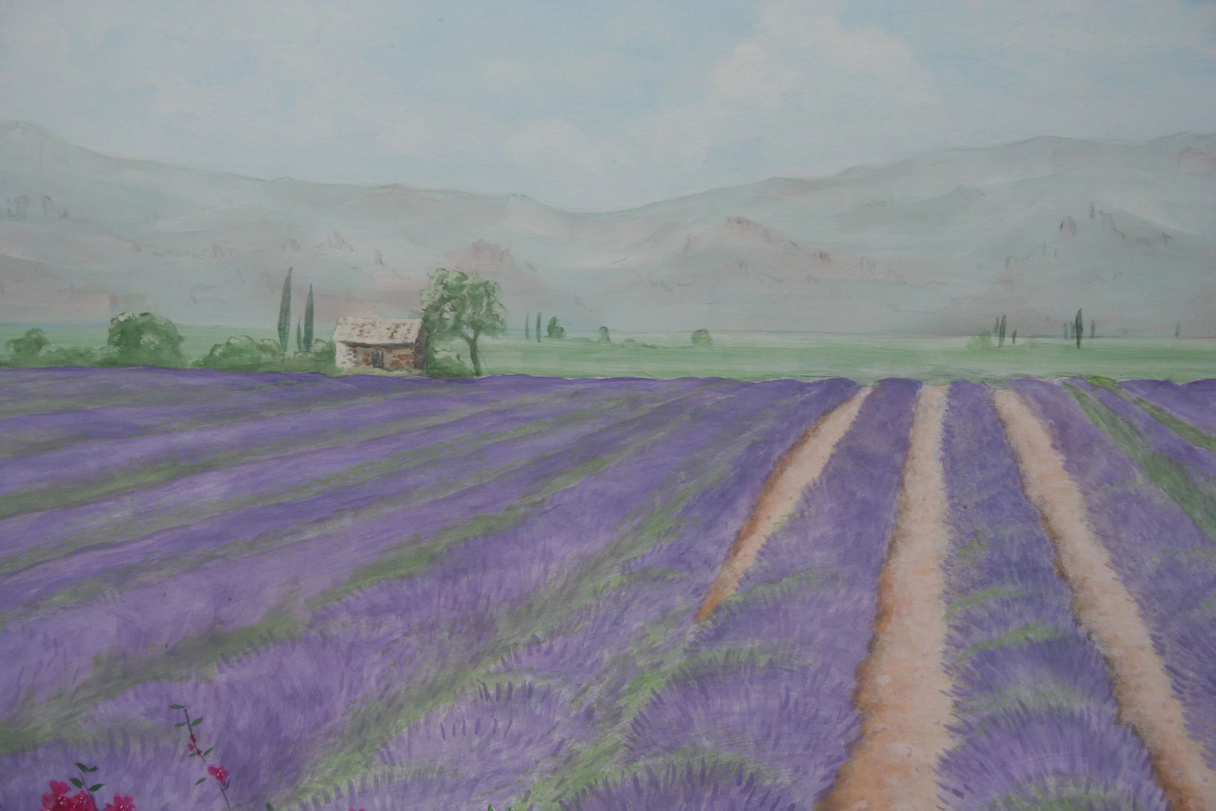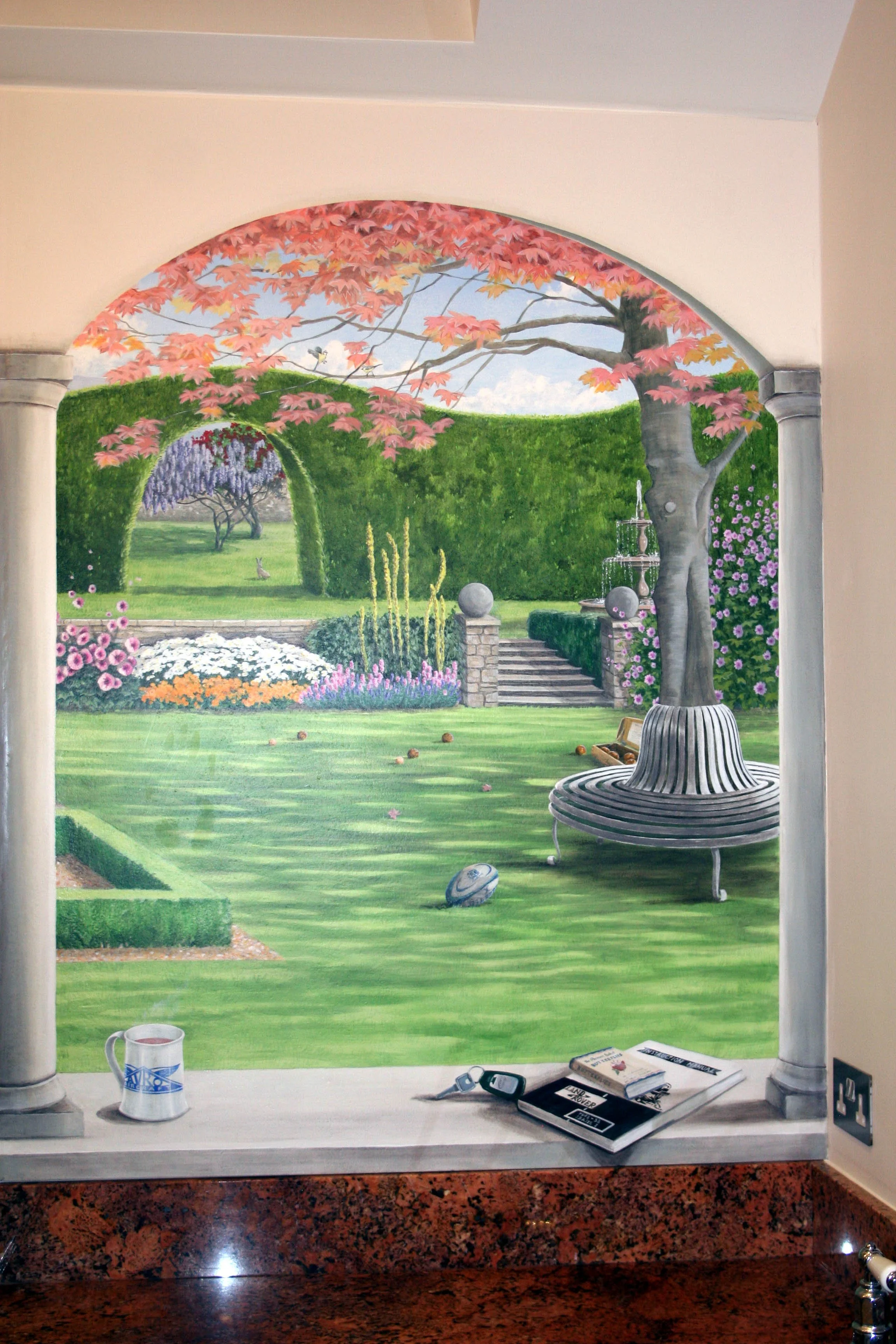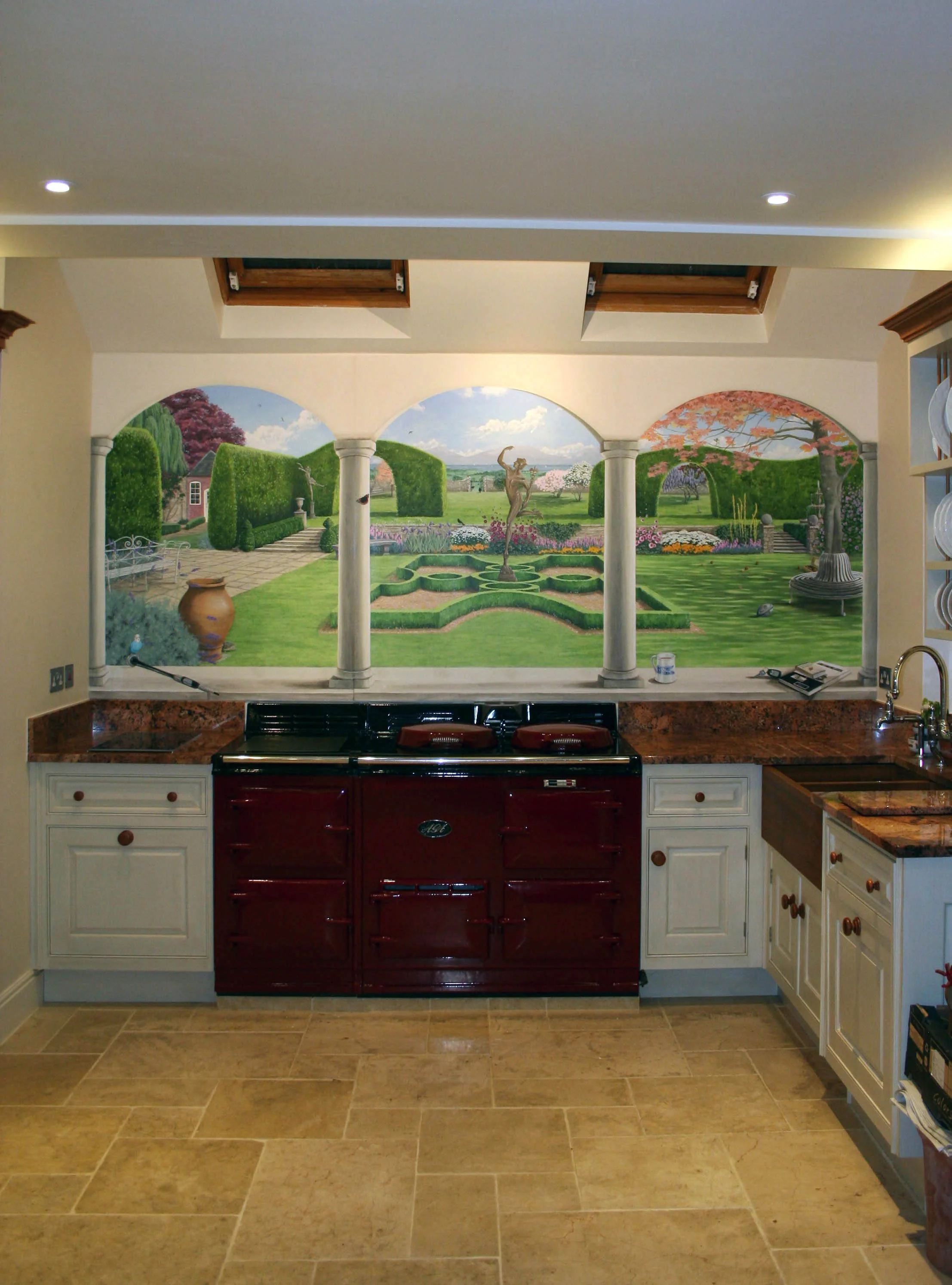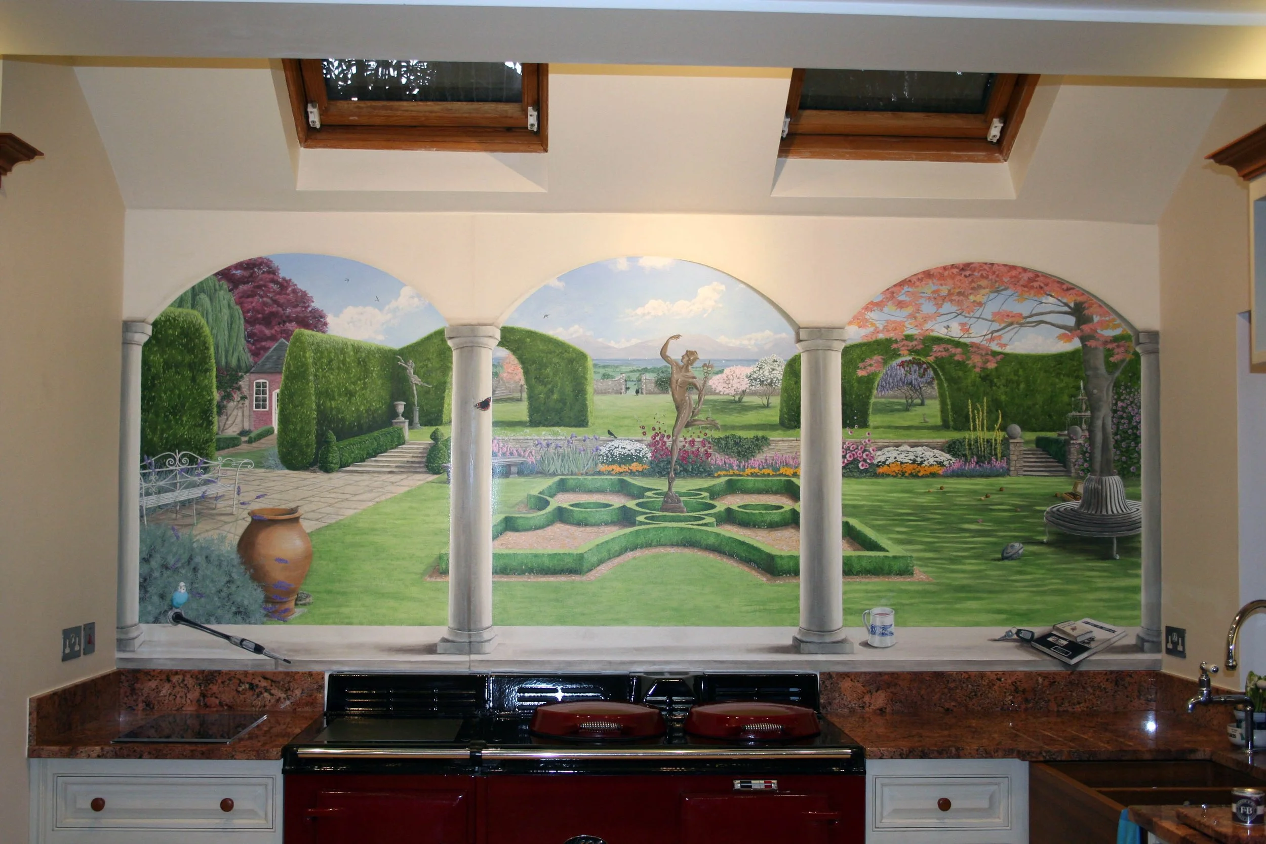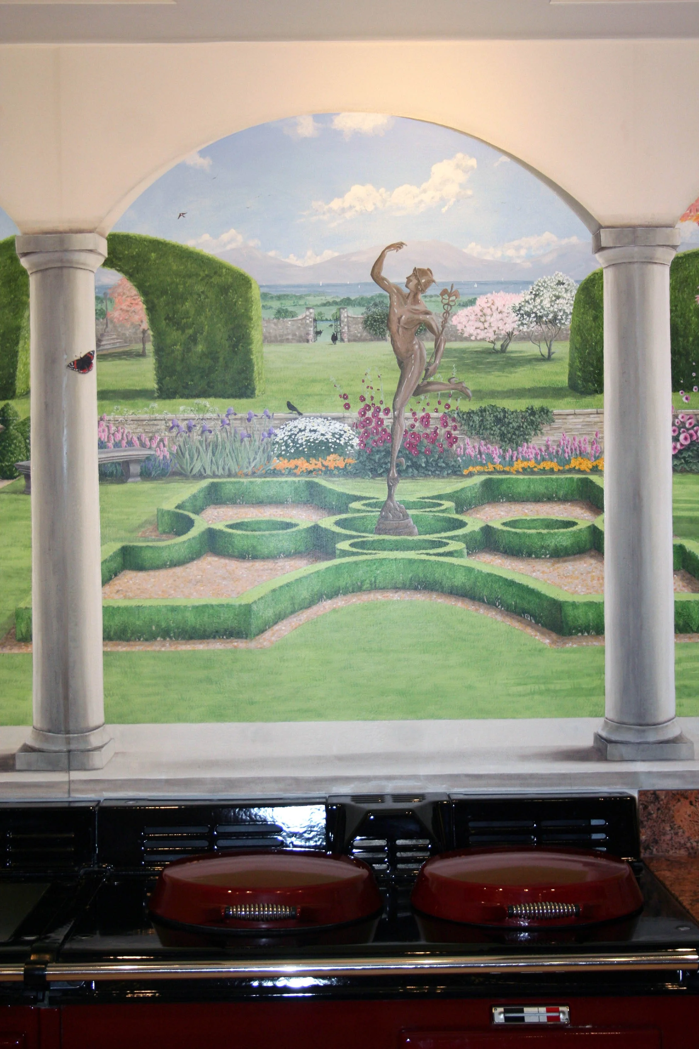 The client was unable to put windows into this wall in the kitchen due to it being a retaining wall, so she decided to do something special with the space instead. For this mural, I captured elements of her previous, beloved garden and little symbols of precious memories in the objects scattered across the view. The mural was painted onto three panels of heat resistant board and screwed into the wall, so if the client wished to move house again, she could take the mural with her. This mural took roughly four weeks due to the level of detail, after developing the idea and choosing the final design.